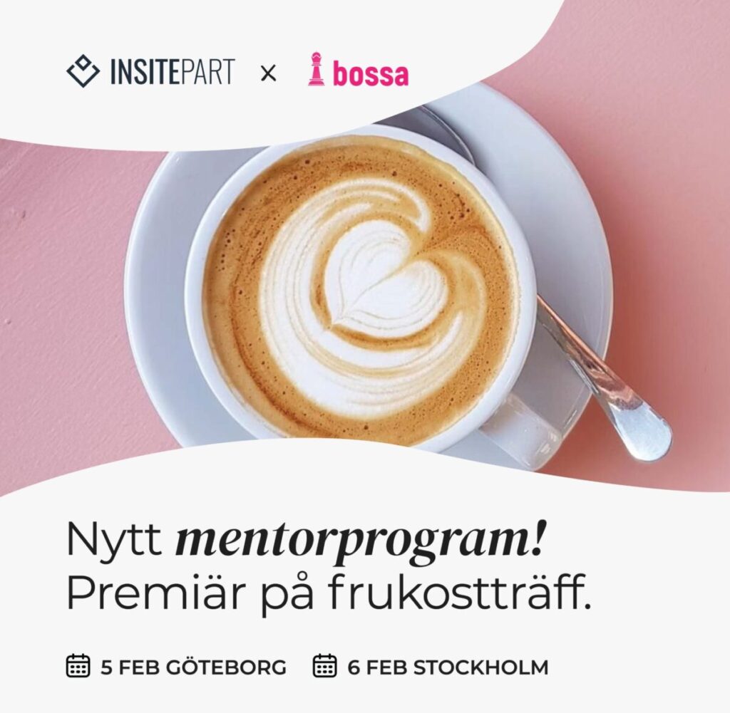 Bossa och Insiteparts mentorsnätverk firar halvåret med en AW, och dit är alla bossor välkomna! I Göteborg äger den rum 9 juni mellan 17-19 i Word Trade Center. I Stockholm den 10 juni på Gordon Deliverys kontor på 18 våningen i skrapan Sthlm01 i Hammarby Sjöstad. Varmt välkommen!