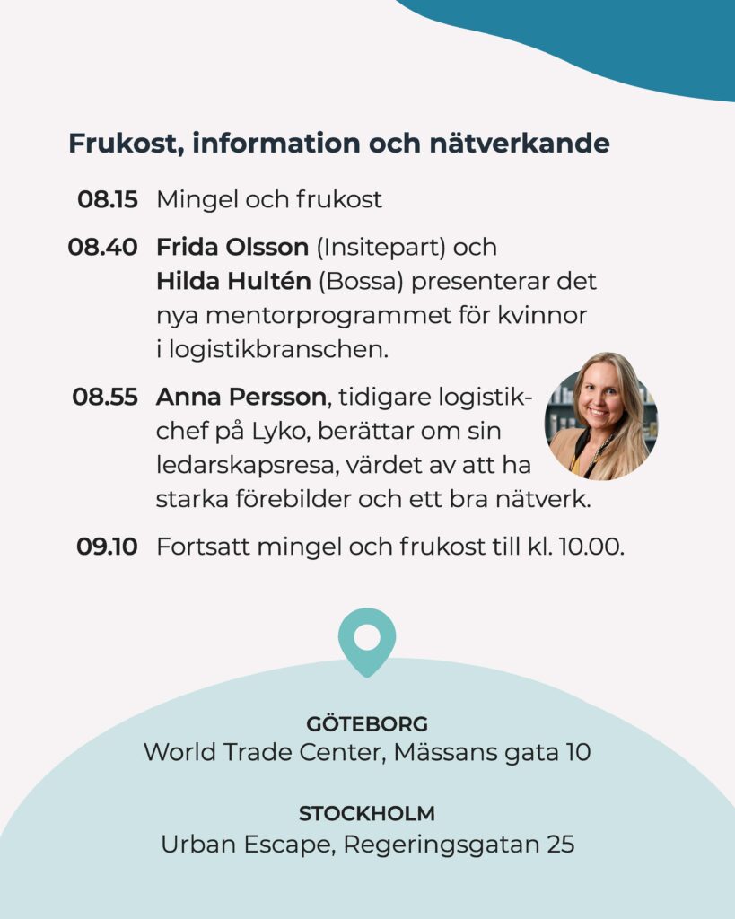 Bossa anordnar två frukostseminarier med Lykos tidigare logistikchef Anna Persson, mingel och nätverkande och info om Bossas nya mentorsprogram: i Göteborg 5/2 och Stockholm 6/2.